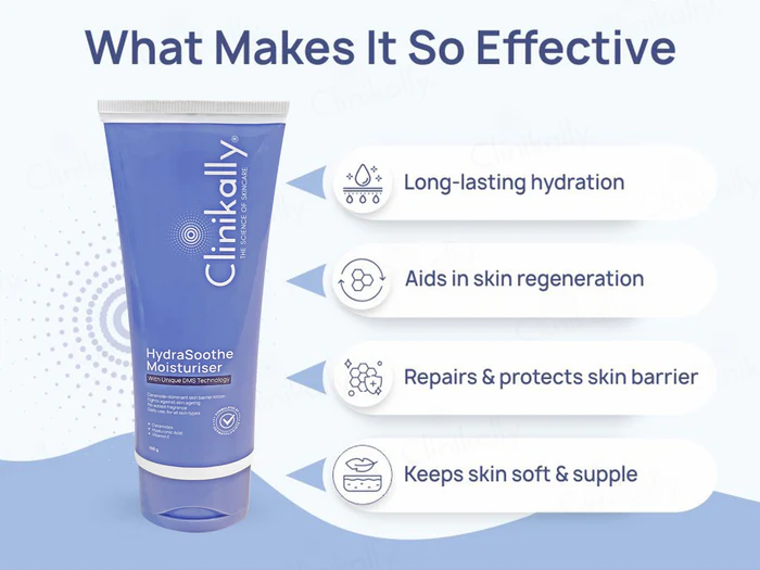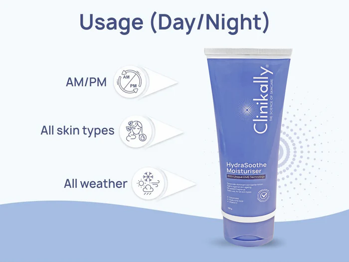 Soothe sensitive skin and relieve dryness, flakiness, and itching with Clinikally HydraSoothe Moisturiser. Its special DMS (Derma Membrane Structure) technology creates a protective layer on the skin which locks moisture into the skin. It also helps your skin get better penetration of ingredients such as Aloe vera and Vitamin E. So, you can use this moisturising lotion to get effective and deep nourishment for skin. It also contains Hyaluronic acid which makes the skin soft and supple, while providing a cooling and hydrating effect. You can use this daily-care moisturiser to improve your skin barrier, texture, and hydration, as well as prevent premature ageing. It is suitable for all skin types and can be used in any weather.